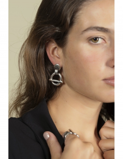 Pendientes bañados en plata de la Colección Pura de Ciclón jewelry. Diseño de motivo en T con aro. Cierre a presión.
